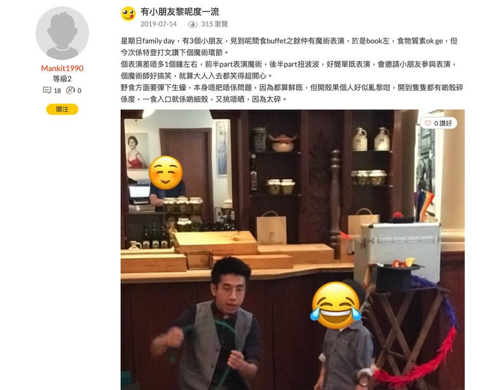 原本已好滿意。經今日去了另一個朋友既生日會,一樣又有請魔術師,睇完之後我更加更加滿意。昨日在你出場約15分鐘已分別有朋友同我講你表演得好好,唔止小朋友開心,大人都睇得好開心,因為有啲笑話你專登係就大人。所以令到毫無冷場。多謝你。